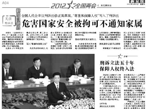 【新唐人2012年3月14日訊】中共第十一屆全國人大五次會議14號早10點閉幕,當天並表決通過中國刑事訴訟法修正案。有律師質疑人大通過的合法性。這將使公安機關不需通知家屬,即可將中共當局認為涉嫌,危害國家安全犯罪、恐怖活動犯罪的嫌疑人監視居住。