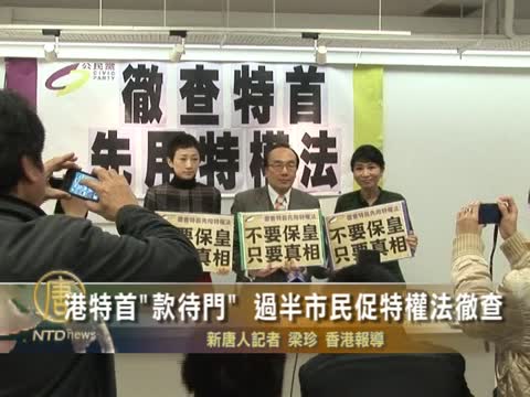 【新唐人2012年3月15日訊】香港行政長官曾蔭權「款待門」事件惹發民怨,星期二,香港公民黨公布一項調查顯示,過半市民認為立法會應該運用特權法徹查事件。而香港大學最新調查顯示,曾蔭權評分為43.5分,跌至任期內新低。
