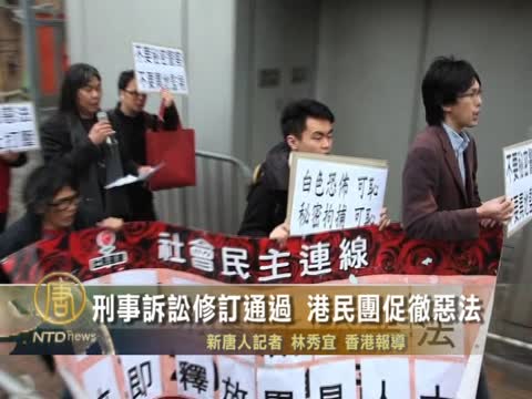 【新唐人2012年3月15日訊】中共全國人大星期三通過備受非議的刑事訴訟法修正案。香港有民團當日遊行到中共駐港辦事處,抗議當局侵害大陸民眾的人權和自由,要求徹銷惡法。