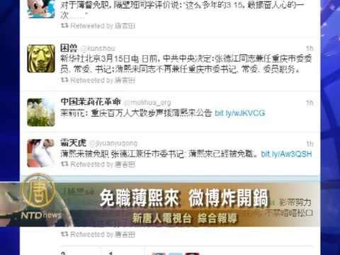 【新唐人2012年3月15日訊】薄熙來被免去重慶市委書記一職,立馬在微博上炸開了鍋,話題焦點彷彿只有薄熙來一人,下面來看看網友說了甚麼。