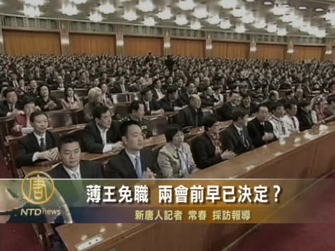 【新唐人2012年3月15日訊】兩會剛一結束,《新華社》突然先後發佈薄熙來和王立軍被免職的「人事公告」.觀察人士分析,對於薄熙來的免職,中央早已經決定,只是不想在兩會時公布,以免增加「不穩定因素」。