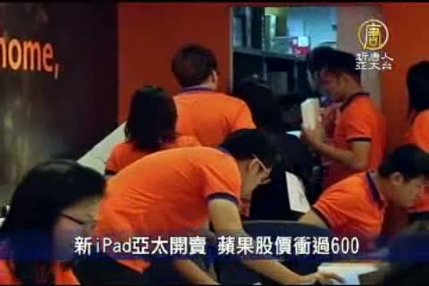 【新唐人亞太台2012年3月16日訊】蘋果公司的新一代iPad已經在亞太地區開賣,蘋果迷們如以往一樣大排長龍,另外,星期四蘋果公司的股價一度衝過600美元大關,有專家預測也許會達到史無前例的700美元。