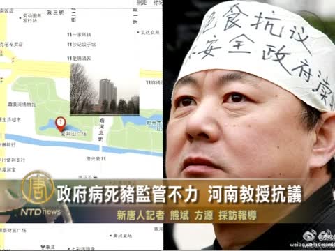 【新唐人2012年3月16日訊】河南財經政法大學教授史璞,近日頭綁白布條,抗議政府對病死豬的問題管理不善,導致死豬肉流向餐桌,危害人體健康。本臺記者採訪時發現,合法肉聯廠也搜購病死豬,民眾健康毫無保障。