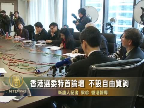 【新唐人2012年3月17日訊】3月25日香港特首選舉進入倒計時,由中共港區人大代表陳智思等13名名選委舉辦的特首選舉論壇,將於下週一晚在九龍灣展貿中心舉行,主辦單位公布細節,將不設公眾席以及自由質詢環節。