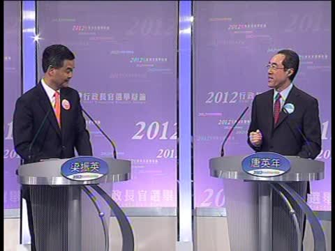 星期五的論壇上,二位建制派候選人多次針鋒相對,唐英年更大爆梁振英醜聞,首先針對梁扼殺言論自由。