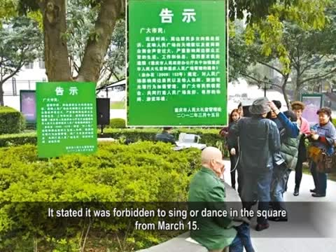 3月15號,重慶人民廣場大禮堂管理處突然在廣場竪起綠色告示牌,從3月15號起,白天晚上都不准在廣場唱歌跳舞。這裡曾被視為重慶「唱紅」標誌之一。據了解,當天已有公安進駐,阻止民眾唱歌跳舞。