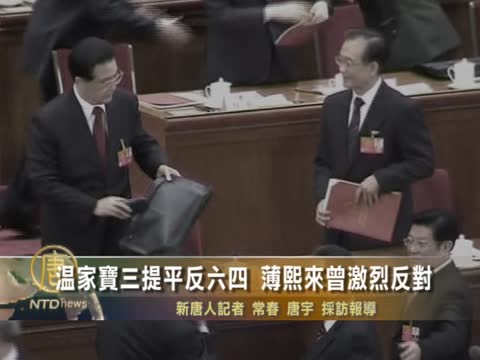 【新唐人2012年3月22日訊】中共總理溫家寶在兩會的「告別」記者會上大提政治改革,日前有接近中共高層的人士披露,溫家寶正試圖打破現行秩序,他想為「六四天安門」屠城事件平反。據說溫家寶之前三次提過要「重新評價」六四,但遭到同僚們的阻止,其中反對最激烈的就是薄熙來
