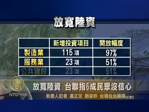 【新唐人2012年3月22日訊】政府擴大陸資來臺,包括製造、服務與公共工程項目都大幅放寬。臺聯黨團今天(22日)公布陸資相關民調,指出6成以上民眾對陸資投資公共工程的品質沒信心,並擔心放寬服務業,將影響就業率。