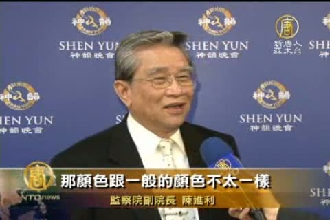 監察院副院長 陳進利:「那顏色跟一般的顏色不太一樣,那個綠也不一樣,藍也藍的很特別,黃紅其實是淡淡的,但是很亮麗,真的全方位的,超級,對,這個藝術真的很棒,你看,我們平常這個都是,這個視聽教育,眼睛最重要,然後你聽的,這個完全都有,一般比如藝術它只是畫展,它只是眼睛,要不然就只是聽音樂, (神韻)這兩種都有,還加上靈性的那個,到最後講神,很棒。」