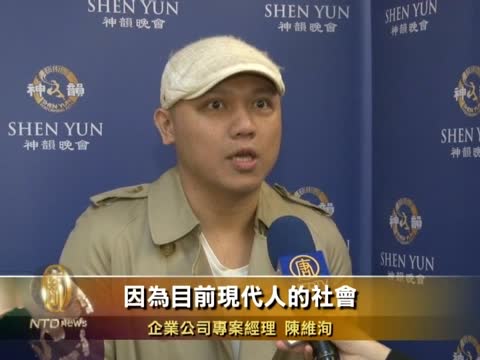 企業公司專案經理陳維洵:「每一部分一開場,或者是對一個音樂下去,就覺得會讓我去專注去注意,每一個細節這樣子,那如果說特定要指的話,就是我覺得舞蹈,舞蹈還有一些中西合併的音樂,我覺得滿吸引人。中國人自己可能會比較,不太,不太會去把那種像中國舞蹈,或者是像那種,像嗩吶有那種樂器,去推廣到世界裡面去,但是我覺得可以藉由這個東西,然後讓很多人認識,其實有這樣的樂器,然後是中國人創的,其實他有自己很獨特的一面這樣子,所以我覺得滿不錯的。」