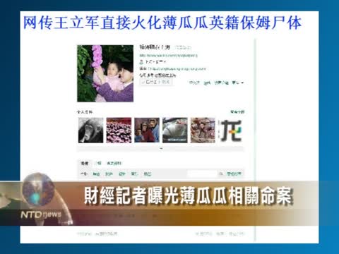 【新唐人2012年3月25日訊】3月24號(星期六),財經雜誌記者楊海鵬通過微博爆料,薄瓜瓜的“英國籍保姆”早先在重慶死亡,在沒調查死因的情況下,屍體被直接火化,當時的案件處理人是王立軍。