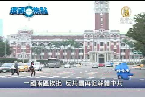 【新唐人亞太台2012年3月25日訊】新聞一開始,首先帶您看到,國民黨榮譽主席吳伯雄會見中共總書記胡錦濤時,所說的「一國兩區」談論,持續發酵,台灣青年反共救國團今天(25號)在圓山飯店舉辦活動,再促中共解體。對於日前吳胡會的「一國兩區」說,理事長林保華批評,這是向中共低頭,官方如果堅持一國就是中華民國,應該在吳胡會上就要提出。