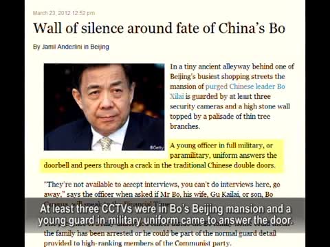 【新唐人2012年3月26日訊】《金融時報》3月23號報導,報社記者試圖採訪薄熙來,但遭到拒絕。報導說,在薄熙來北京的豪宅,至少裝有三個攝像頭,一名身穿軍裝的年輕軍官出來應對記者。當《金融時報》記者問是否可以和薄熙來、妻子谷開來和兒子薄瓜瓜聊聊時,軍官答道:「他們不接受採訪,你不能在此採訪,走開。」薄熙來豪宅的鄰居和當地業主說:不能確定薄熙來及家人是否住在裏面。《金融時報》引用可靠的消息來源指稱,薄熙來和妻子已經被關押,可能面臨不明指控。報導還表示,因爲薄熙來在15號被免職後,官方再也沒有說法,傳言填補了資訊真空,北京城內關於「政變未遂」和「暗殺」的說法氾濫。