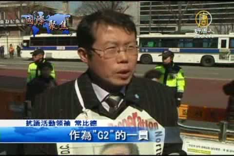 抗議活動領袖常比德( Peter Chung)牧師呼籲胡錦濤承認脫離北韓者“難民”的身份,他表示中國現在與美國一樣,是“G2”國家,也是G20集團的領導國家。