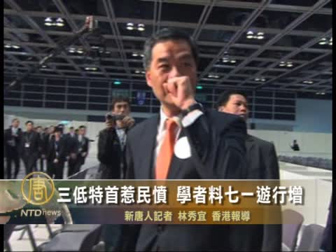 【新唐人2012年3月27日訊】梁振英當選香港行政長官後,第一時間拜訪中聯辦等機構。有學者認為梁以三低當選,民憤已逼近03年反23條的臨界線,除面臨管治危機外,相信會進一步推高今年七一大遊行的人數。