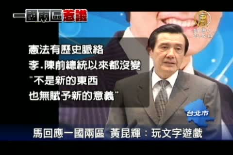 【新唐人亞太台2012年3月29日訊】繼續來看到,國民黨榮譽主席吳伯雄在北京提出「一國兩區」爭議持續發酵。馬總統昨天首度對「一國兩區」提出說明,他說一國兩區不是新的東西,是前陸委會主委黃昆輝民國81年就談過,不過今天,黃昆輝親自回應, 強調馬總統混淆當年的時空環境與修法的背後精神,是在玩弄文字遊戲。