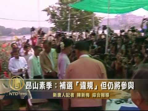 【新唐人2012年3月30日訊】緬甸民主派領導人昂山素季星期五(3月30日)表示,儘管由軍方支持的政治系統,在4月1號將進行的議會補選中有“違規”和“非法”行為,但她所領導的政黨——全國民主聯盟(民盟)將繼續競選活動。