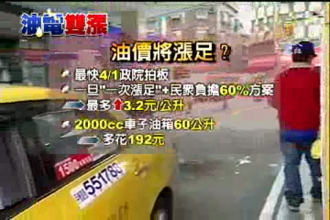 根據平面媒體報導,油價要怎麼漲?漲多少?行政院最快4月1日就會拍板定案,一旦油價決定一次漲足。而且中油之前因為減半調漲所吸收的每公升5塊多,如果敲定由消費者負擔其中的60%,不排除從週一凌晨開始,汽油每公升一口氣最多調漲3.2元,以一台汽車加滿60公升油箱來估算,就得多花192元,漲幅將近一成。