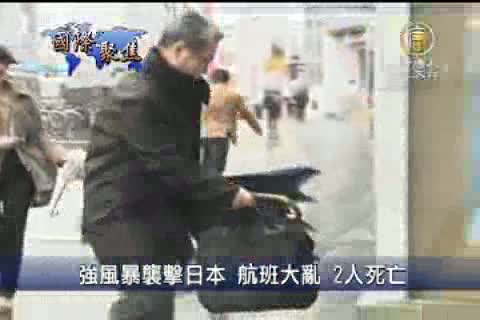 【新唐人亞太台2012年4月4日訊】來看到國際重要訊息。從4月3日上午開始,一波強風襲擊了日本的大部份地區,日本國內線至少取消了5百個航班,這一波強風至少導致2人死亡,多人受傷。