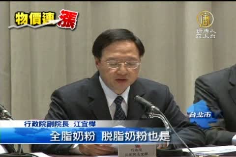 行政院副院長 江宜樺:「社會大眾很關心嬰幼兒奶粉,還有調製奶粉以及其它調製奶粉,有3項奶粉產品關稅,我們會到101年5月24號為止,實施機動調降,另外像奶油、玉米粉、黃豆粉有四項貨品關稅,到5月31號之前機動調降,全脂奶粉、脫脂奶粉也是。」