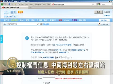 【新唐人2012年4月7日訊】中共當局近日關閉十多家政治網站,其中包括左派大本營網站「烏有之鄉」和「毛澤東旗幟網」等,而部分右派網站也暫停論壇功能。目前中國互聯網的動態千變萬化,這次連同左、右派一起封殺,引人關注。有專家指出,這是中南海要刪除所有關於權力鬥爭的禁忌話題,控制輿論。