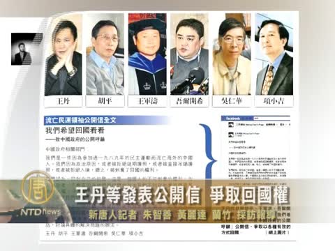 【新唐人2012年4月7日訊】回應北京當局在王立軍事件後,提出的為六四平反,和網傳溫家寶希望能允許89年天安門事件後,流亡海外的學生和民主人士回國探訪。此一消息受到王丹、胡平等流亡學者歡迎,目前已有6人發表聯名公開信,期待回國看一看。