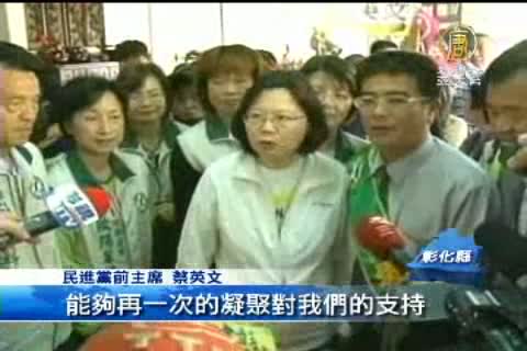 【新唐人亞太台2012年4月8日訊】彰化前鹿港鎮長王惠美當選立法委員,遺缺將在28日補選,民進黨徵召縣議員黃振彥,國民黨則是提名醫師蔡明忠,今天(8號)前民進黨主席蔡英文、國民黨的副總統當選人吳敦義,不約而同來幫黨籍參選人站台造勢。