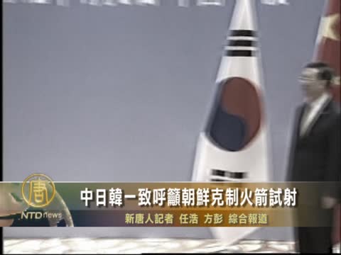 【新唐人2012年4月9日訊】中日韓三國外長星期日(4月8日)在中國寧波舉行三邊會談,會晤上就朝鮮發射衛星計劃一致呼籲朝鮮保持克制。