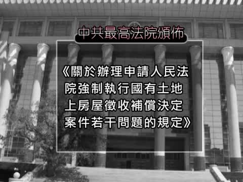中共最高法院頒佈《關於辦理申請人民法院強制執行國有土地上房屋徵收補償決定案件若干問題的規定》共11條,10號起實施。