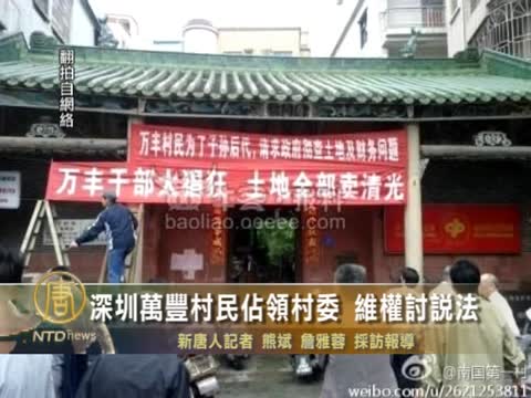 【新唐人2012年4月10日訊】廣東深圳市有著“南國第一村”稱號的萬豐村,是中國率先推行股份制的農村先例;由於帳務不清,管理不善,加上村民向上陳情沒有結果,村民開始上街遊行、堵路抗議,近日,村民還佔領村委會,表達誓死討回土地及尊嚴的決心。