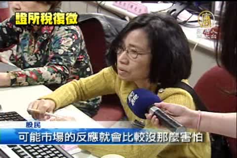 【新唐人亞太台2012年4月10日訊】謝謝吳教授的分析,來看到今天的財經訊息。台股在今天(10日)上午以上漲58點開出,之後持續維持上漲,投資人認為是因為昨天(9日)財政健全小組開會,傳出證所稅最快後年5月開徵,這項比較確定的消息,使得今天大盤上漲。不過雖然大盤上漲,投資人似乎還是對開徵證所稅,有不同的意見。
