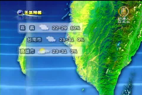 【新唐人亞太台2012年4月11日訊】今晚到明天的上半天受鋒面通過影響,北部、東半部地區及中部山區下雨的機率將逐漸提高,氣象局也針對大臺北地區及基隆北海岸發佈大雨特報,不過這一波鋒面帶來的溫度變化並不明顯,北部及東北部的低溫都還能維持在20度左右,但是隨著氣溫回升加上水氣影響,西半部及外島地區容易出現局部霧,交通往返的朋友們請注意安全。以下帶您關心4月12號星期四的天氣預報。