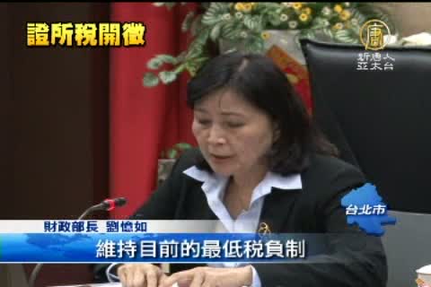 【新唐人亞太台2012年4月12日訊】財政部長劉憶如今天晚間(12日)舉行記者會,正式公布財政部版本的證券及期貨交易所得的課徵方案。