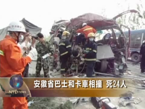 【新唐人2012年4月12日訊】星期四(4月12日)早上6點半左右,在中國安徽省的高速公路上,發生巴士和運沙卡車相撞事故,造成至少有24人喪生。