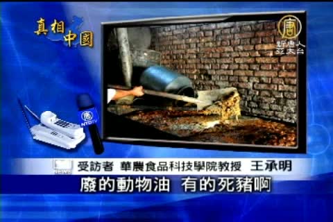 【新唐人亞太台2012年4月14日訊】日前,中共公安機關宣稱各地抓獲大批生產銷售「新型地溝油」,這種地溝油用腐爛的動物內臟、皮和肉加工熬制,以食用油的名義銷售。從事油脂加工研究的華農食品科技學院教授王承明表示,這種油有可能來自死豬,或沒有經過檢驗檢疫的動物。