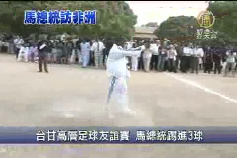 【新唐人亞太台2012年4月15日訊】馬總統訪問甘比亞,最後一天的重頭戲,除了簽署聯合公報,就是兩國元首PK踢足球,高中跟大學都踢足球的馬總統,球技果然不含糊,3次踢球都進球,比賈梅總統多進一球,雖然閣員中只有外交部長楊進添進球,不過靠著馬總統獨進3球,台灣3戰2勝,總算討回面子。
