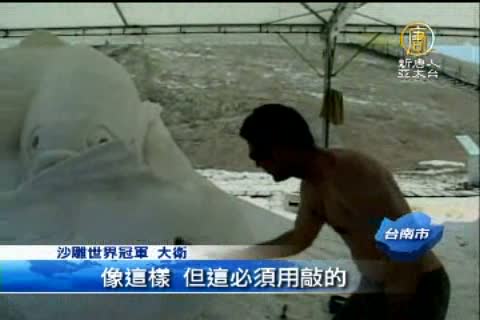【新唐人亞太台2012年4月15日訊】臺南七股鹽山有一場鹽雕創意賽,吸引沙雕世界冠軍和臺灣雕王等藝術家來挑戰。大伙第一次雕鹽雕,都覺得很困難,因為鹽結晶後會愈來愈硬,感覺比較像在做石雕,而不是沙雕。另外,鹽還會反射太陽光,紫外線比直射還要強兩倍,因此創作者還必須配戴太陽眼鏡,長穿袖來防曬。