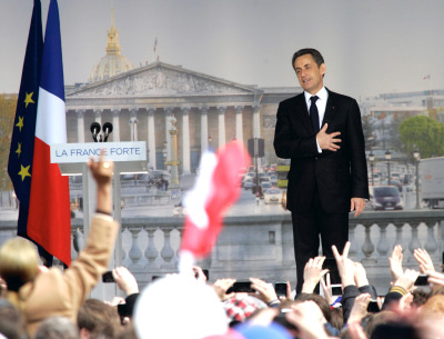 下午3點半,薩爾科齊到場,進行了近30分鐘的演說,他的競選口號為'強大的法國'。