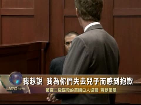 【新唐人2012年4月21日訊】因槍殺黑人少年馬丁而被控二級謀殺的美國白人協警齊默爾曼20日出席保釋聽證,他在庭上向馬丁的家人表示歉意。最終法庭允許齊默爾曼獲保,保釋金數額為15萬美元。