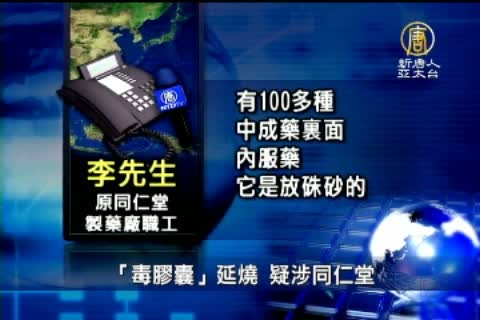 據報導,被涉及的9家藥廠分佈在北京、江西、吉林、青海等地,所用膠囊的重金屬鉻含量,經檢測,超標最多的達90多倍。有知情人士向《新唐人》披露,大陸中藥業中第一品牌的同仁堂也不例外。