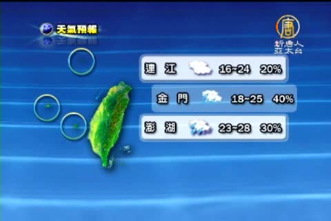 【新唐人亞太台2012年4月22日訊】以下帶您關心4月23號星期一,全台各地以及世界各主要城市的天氣預報。