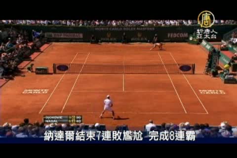 【新唐人亞太台2012年4月23日訊】擁有「紅土之王」封號的西班牙前球王納達爾,22日終於在蒙地卡羅名人賽單打決賽中,以直落二橫掃現任球王喬科維奇 ,締造在蒙地卡羅紅土球場42場連勝、8連霸傳奇,同時,也結束對喬科維奇連7場敗戰的尷尬,重新證明了納達爾在紅土賽場上的威力。 這已經是兩位前後任世界球王的第31度對決,雖然納達爾總戰績以16勝14負稍佔上風,但最近7次對決,包含去年在馬德里和羅馬大師賽的2場紅土賽事,納達爾都栽在喬科維奇的拍下。這回面對剛失去祖父的喬科維奇,納達爾總算佔上風,從首盤以1比1平手後,納達爾就一路領先,最終只花了