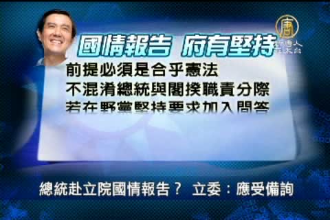 【新唐人亞太台2012年4月26日訊】在野黨要求總統到立法院做國情報告,昨天(25日)晚上府方對外回應,總統樂見立法院通過這決議,但是如果要採取任何問答方式,府方認為將創下憲政惡例,不過在野立委今天(26日)召開記者會反駁,認為總統才是真正有決策權的人,應該接受備詢,不能躲在行政院長陳沖的後面。