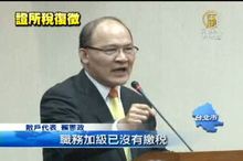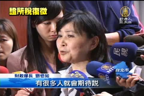 【新唐人亞太台2012年4月26日訊】行政院院會上午通過復徵證所稅案,調整財政部版本,將個人證所稅扣除額從300萬元提高到400萬元,稅率由20%降為授權行政院在15%至20%之間定之,證交稅不列為費用減除,但稅額半數可扣抵證所稅。個人期所稅則確定不課徵。