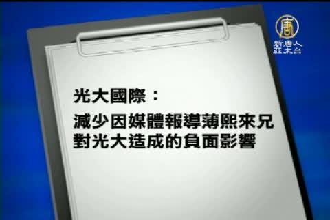 【新唐人亞太台2012年4月26日訊】隨著前重慶市委書記薄熙來的落馬,案情一發不可收拾,目前他的親屬也受到波及。薄熙來的長兄薄熙永,已經辭去中國國企「光大國際」副主席一職,希望能對公司的殺傷力降到最低。