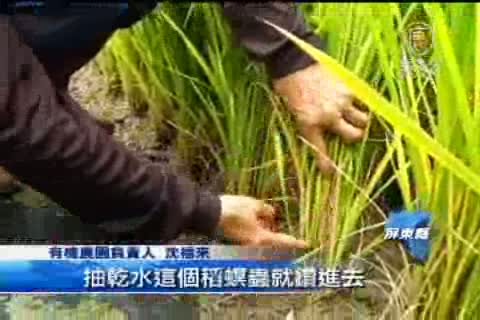 有機農園負責人 福來伯:「抽乾水這個稻螟蟲就鑽進去,差不多在這裡鑽進去,咬裡面的心(稻子)就死了,我用盡腦筋把水淹到這裡,半小時牠就受不了就都跑出來,跑出來動,牠在水面動,青蛙看到就吃了。沒公開就不是傑出了,沒人知道自己做自己知道而已,對社會較沒貢獻。」