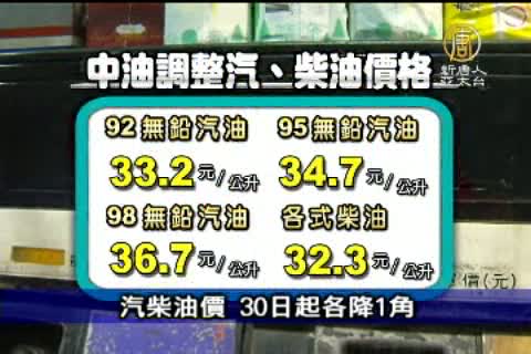 近日國際原油價格未見大幅波動,中油與台塑石化宣布,從30號凌晨零時起,調降各式汽、柴油價格每公升新台幣0.1元。調整後,參考零售價分別為92無鉛汽油每公升33.2元、95無鉛汽油每公升34.7元、98無鉛汽油每公升36.7元、超級柴油每公升32.3元。