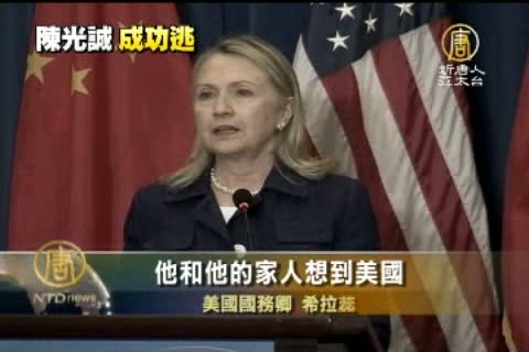 美國國務卿 希拉蕊:「我們的使館工作人員和醫生,已經和陳光誠見過面,他本人證實,他和他的家人想到美國,這樣他可以繼續讀書深造。在這方面,我們今天也很高興看到來自中國政府的聲明說,確認答應他可以申請出國深造。」