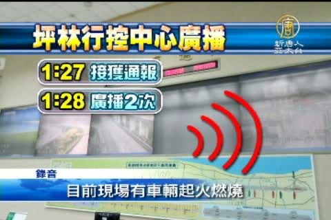 【新唐人亞太台2012年5月8日訊】雪隧火燒車事件,傳出葛瑪蘭客運司機抱怨,事發當時,他用隧道內的緊急電話打了6通才有人接,而且,事故發生5分鐘之後才進行廣播,質疑坪林行控中心救援反應太慢,對此,高公局坦承人力不足,會開闢一支專線給用路人,同時也澄清,行控中心接獲通報後一分鐘就馬上廣播。