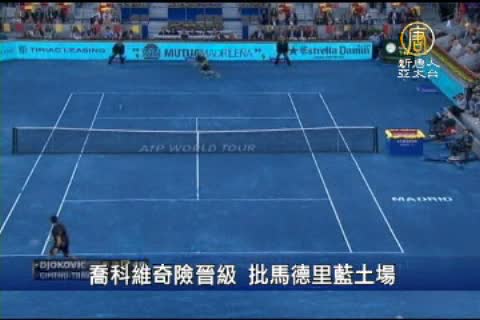 【新唐人亞太台2012年5月9日訊】網球世界排名第一的喬科維奇,在馬德里公開賽登場亮相,經過1小時46分鐘的苦戰後,以6-2/2-6/6-3擊敗西班牙好手特拉維爾晉級第三輪。女單方面,艾薩蘭卡和莎拉波娃則是雙雙晉級。